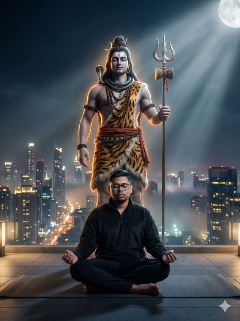 Behind his shoulder, slightly out of focus, a realistic depiction of Lord Shiva appears — detailed face, natural bluish undertone, crescent moon visible, but softly blurred due to shallow depth of field.