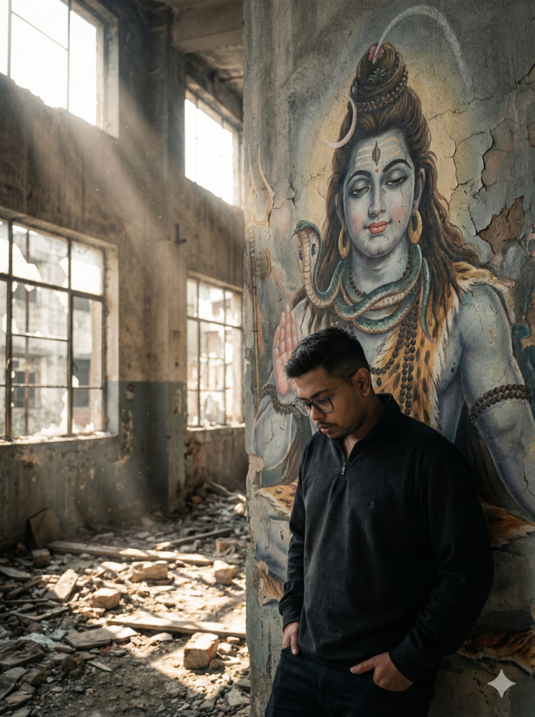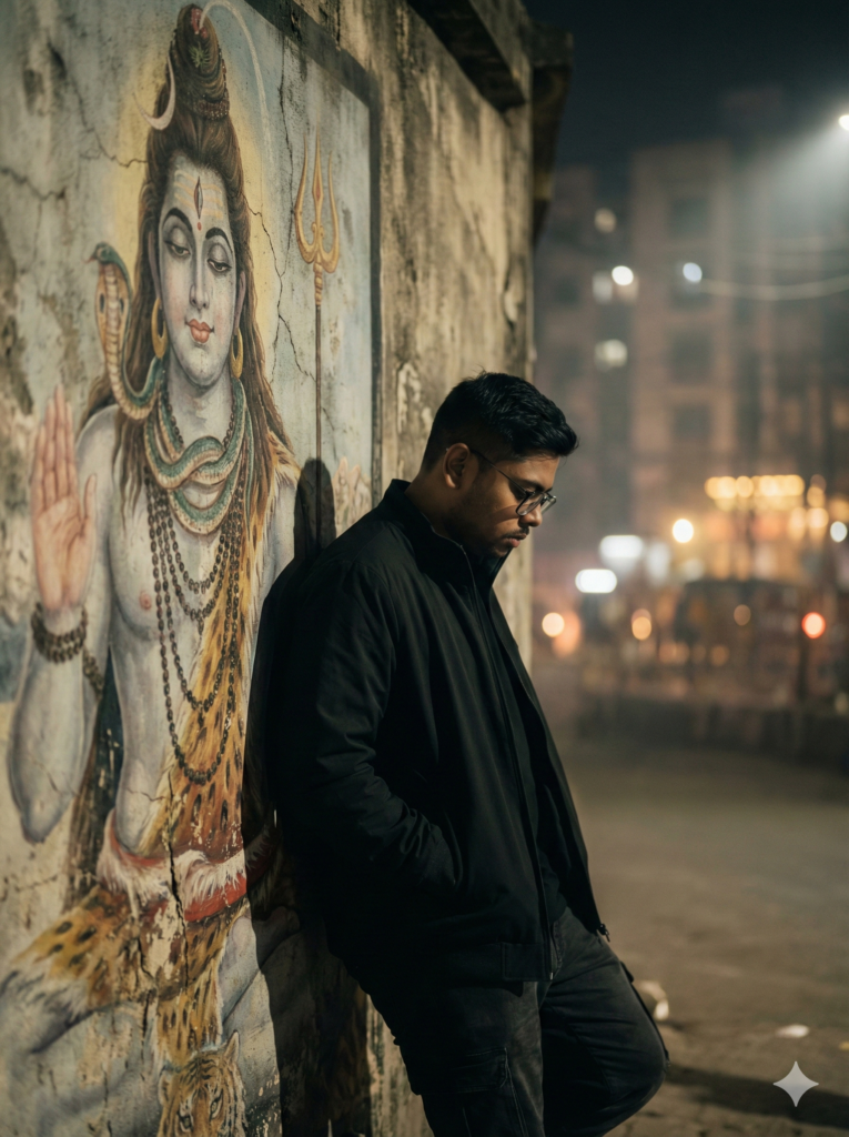 Create a hyper-realistic cinematic 8K image of a young modern Indian man standing alone at night, leaning gently against a slightly old textured concrete wall. The wall has a large, beautifully painted mural of Lord Shiva — not brand new, slightly faded but still detailed and powerful. The painting looks artistic and realistic, not devotional poster style. Subtle cracks and aging texture visible on the wall.