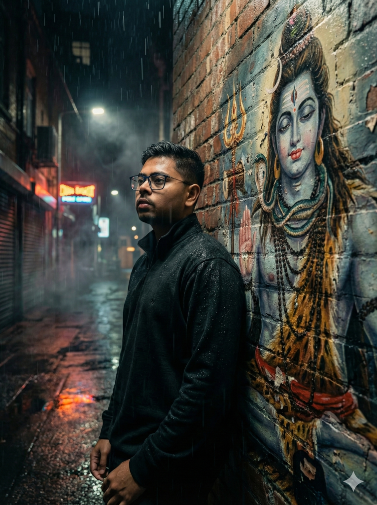 Generate an ultra-realistic 8K cinematic night scene of a young man standing beside an old brick wall in a rainy urban alley. On the wall, there is a large painted mural of Lord Shiva — slightly weathered, artistic, textured, with realistic brush strokes visible. The painting is not glossy or new; it looks authentic and aged but still beautiful.