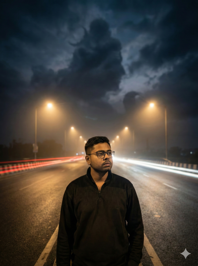Create an ultra-realistic cinematic 8K night scene on an empty highway. A young man stands alone in the middle of the road under dim streetlights, looking toward the horizon.