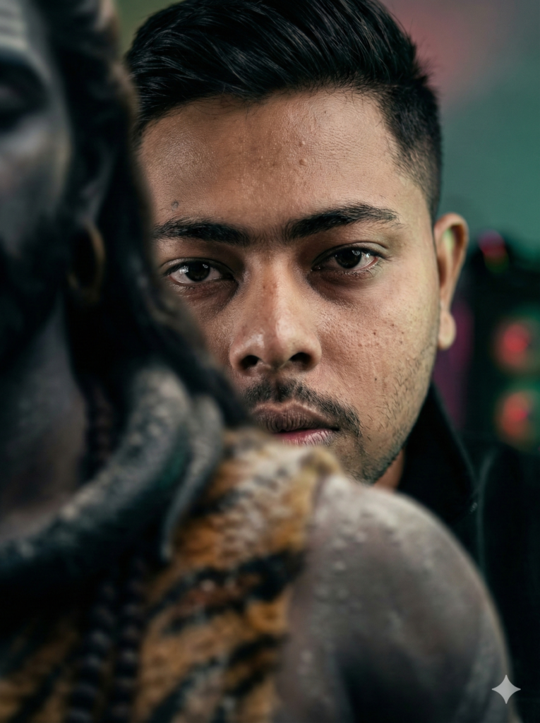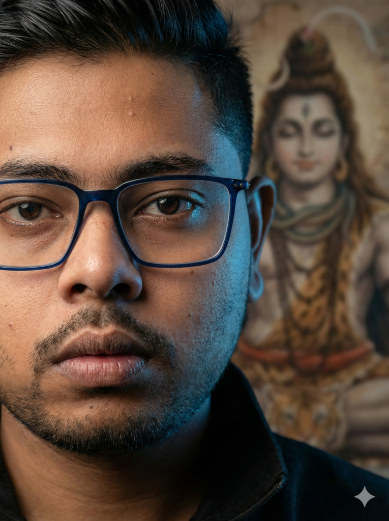One side of his face is illuminated with warm soft light, the other side has a cool blue rim light. In the blurred background, slightly out of focus, a textured wall mural of Lord Shiva is visible — artistic, realistic, not glowing.