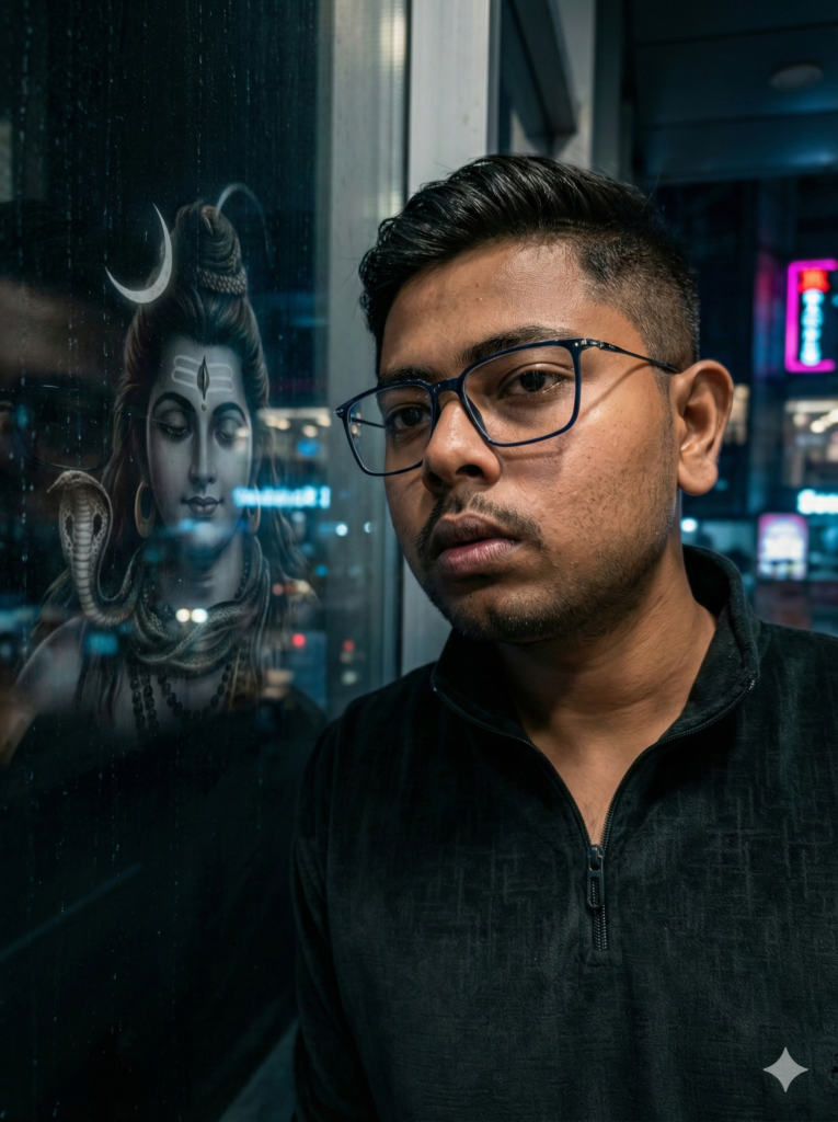 In the glass reflection beside his face, the subtle reflection of Lord Shiva appears — realistic features, crescent moon, serpent detail, but slightly softened by glass distortion.